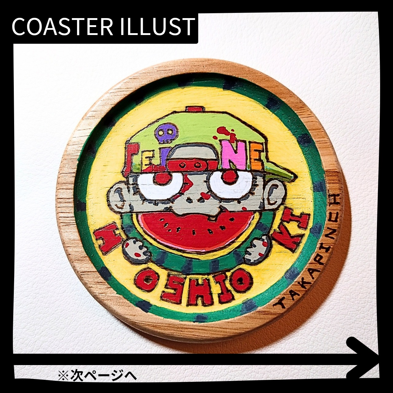 木のコースターに電熱ペンで描きアクリルペンで色塗りしました。