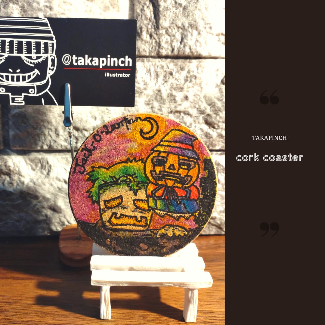 コルクのコースターに、オリジナルイラストを描きました。