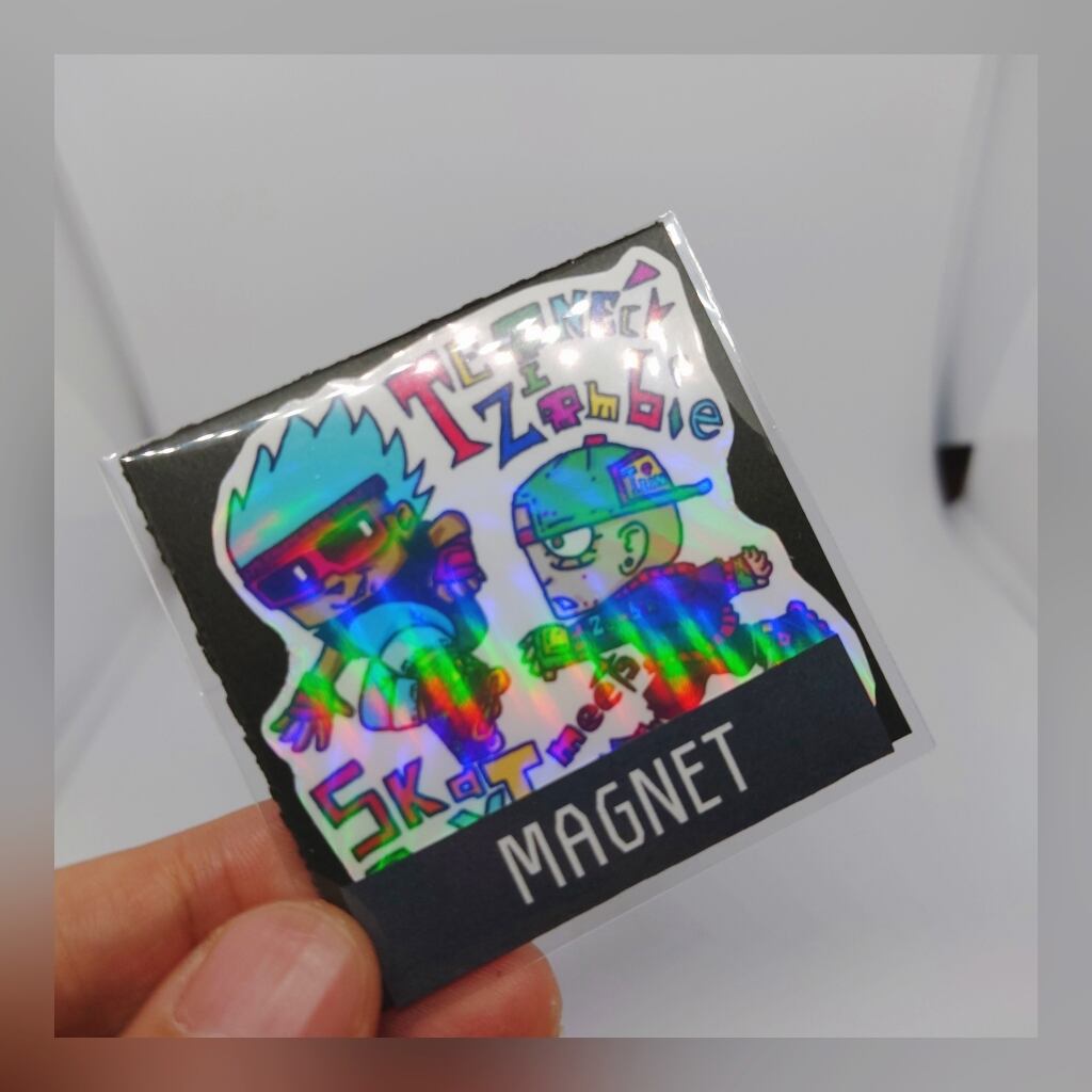 スケートボーイとゾンビ君が出会うイラストが描かれた、かわいいマグネットです。直径6cmの小さなサイズで、冷蔵庫やホワイトボードなどに貼ることができます。お部屋やキッチンを少し変えて、楽しく彩ってくれるアイテムです。