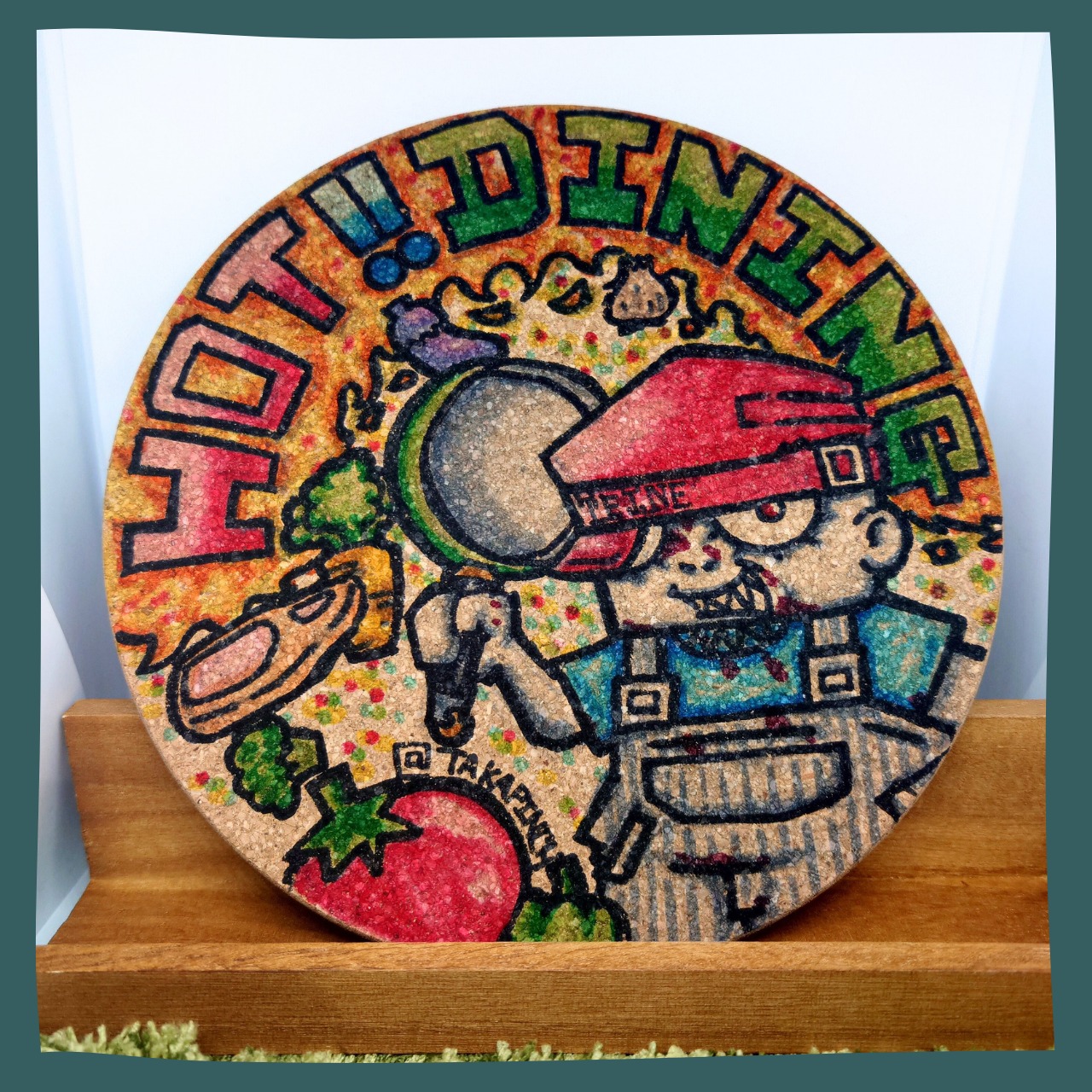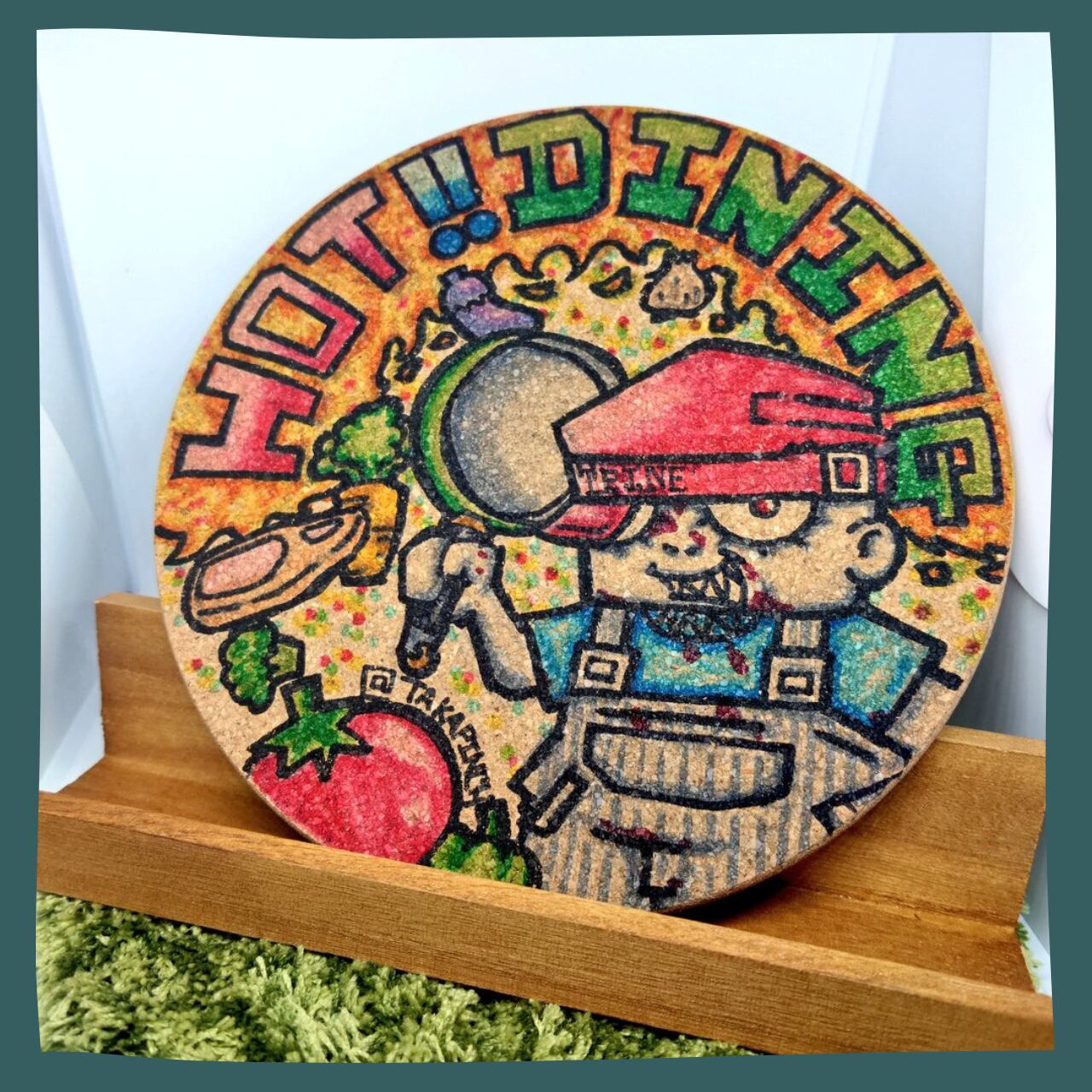 コルク鍋敷に描かれた『HOT!!DINING』、鑑賞用としてご使用いただけます。