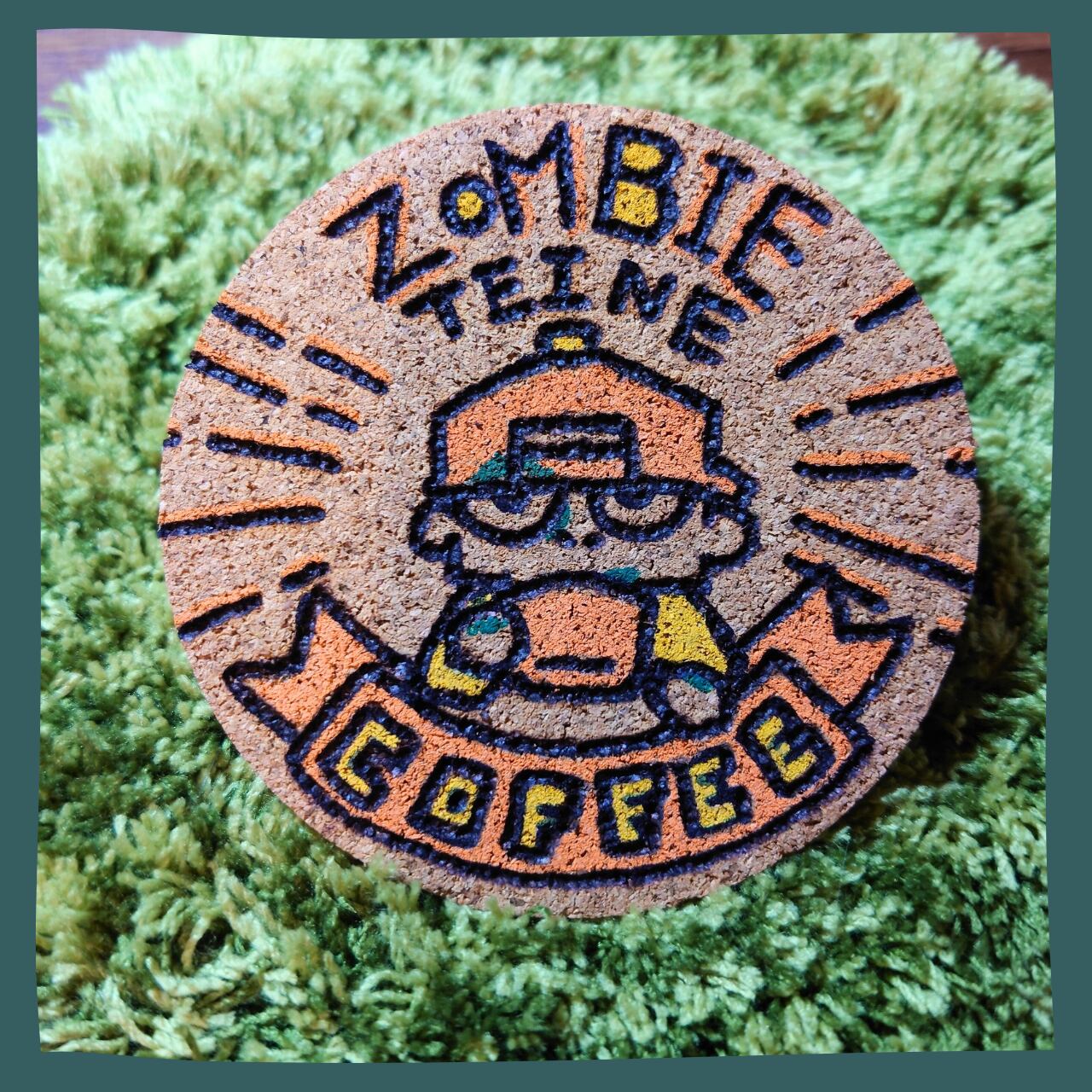 コルクコースターへハンダコテで描き、耐水性顔料ペンで色付けしました。